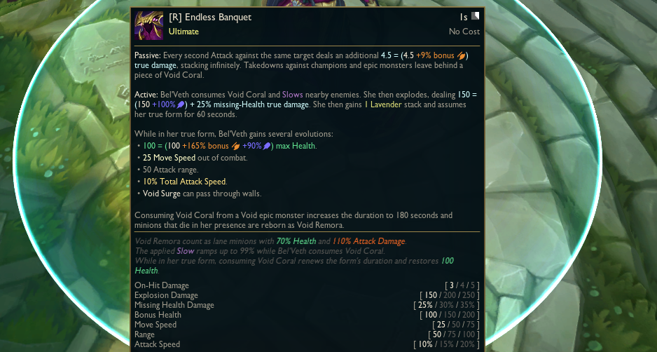 Bel'Veth is now currently enabled and available to play on PBE! She's super fun to play, and I want to hear your player feedback before she launches in two weeks. We've got about a week before we have to lock any proposed changes for her release, so I'll be monitoring common themes in this thread to share back with the team for possible adjustments.