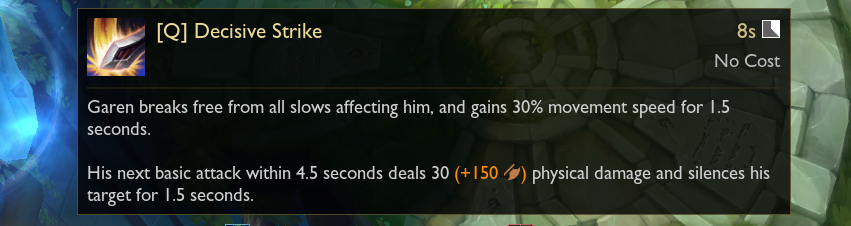 - Decisive Strike (Q) bonus physical damage increased from [30/60/90/120/150 (+ 40% AD)] to [30/60/90/120/150 (+ 50% AD)